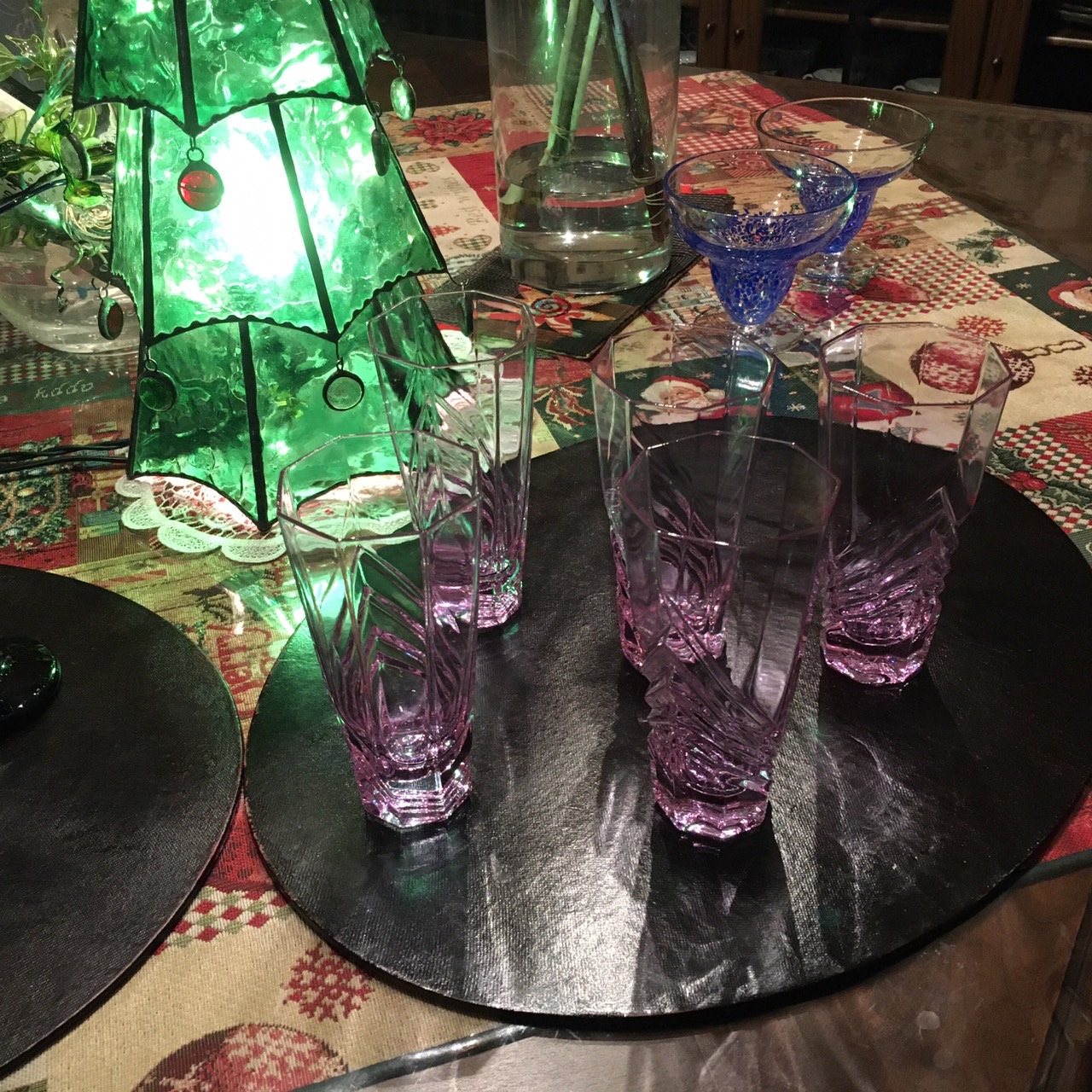 ※ちなみに、この右のほうにある薄紫のグラスがなんと!白熱灯の部屋では薄紫なのですが、蛍光灯の部屋では薄いブルーになるんです!!