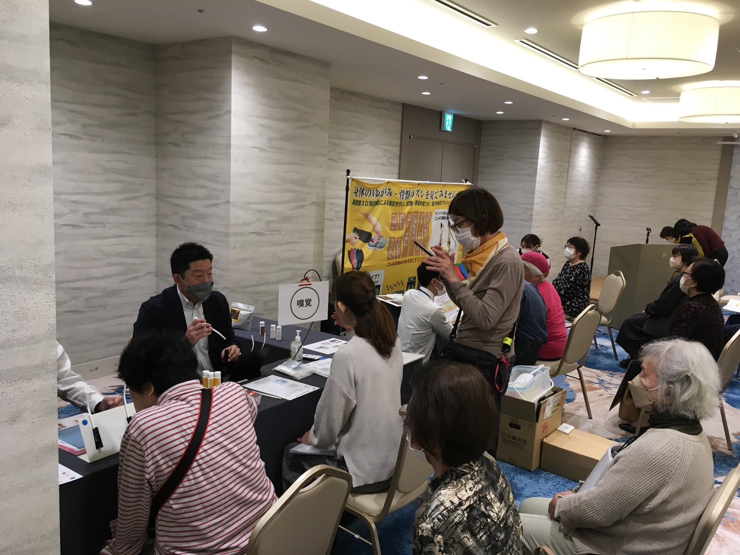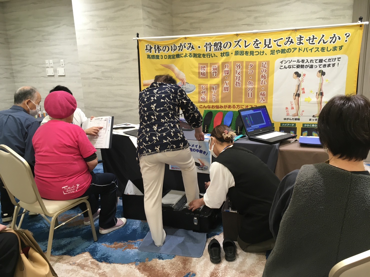 色々なことがあり、パンフレット(私が1から作りました!)が、中々出来上がらなくて少々焦りました。チラシがないことには声掛けもできなかったからです。ただ、周りの人や生徒さんには口頭で伝えてはいました。パンフレットの出来上がりを待たずして、申し込みが入り、どこまで伸びるか心配でした。初めてのことですし、来て下さった方々にご迷惑をかけないように、丁寧に測定をしてあげたいと思い、30名くらいまで到達したときに、もう十分だと思って、営業の声かけを辞めていました。しかし、自然と待っていたら、本人が参加できなくなった方でさえ、お友だちを紹介して下さる方もいて、来客の方、出展社様の方々を含めると定員オーバーになりました。