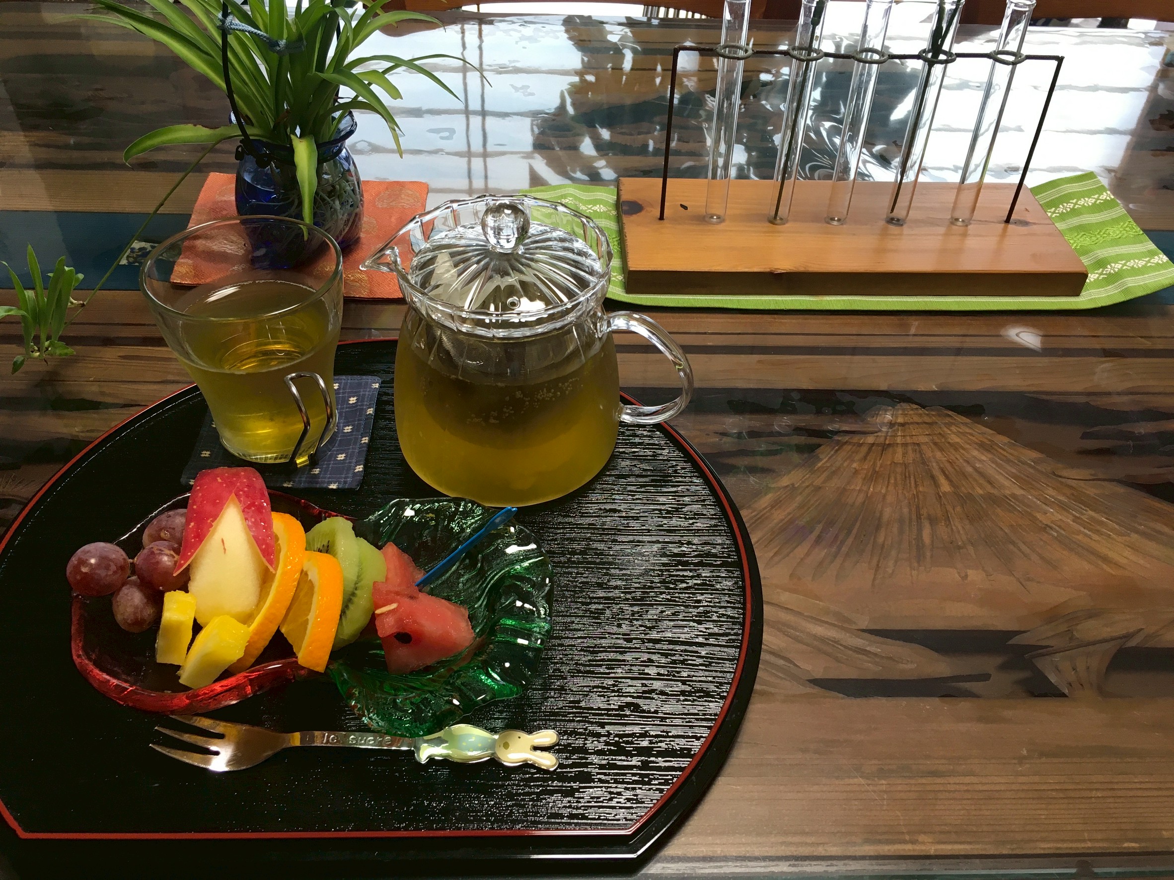 おやつは、先月「来月のおやつはなにがいいですか?」と聞いたところ、「スイカがいい!」といっていたので、フルーツの盛り合わせにしました。冷たくて美味しかったです。