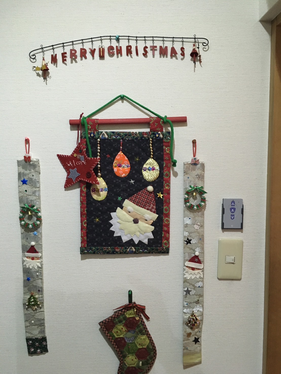- クリスマス…リースは福祉施設の人たちの作品です。千葉駅で売っていました。 サンタさんは私の創作、その下にはブローチも付けました!